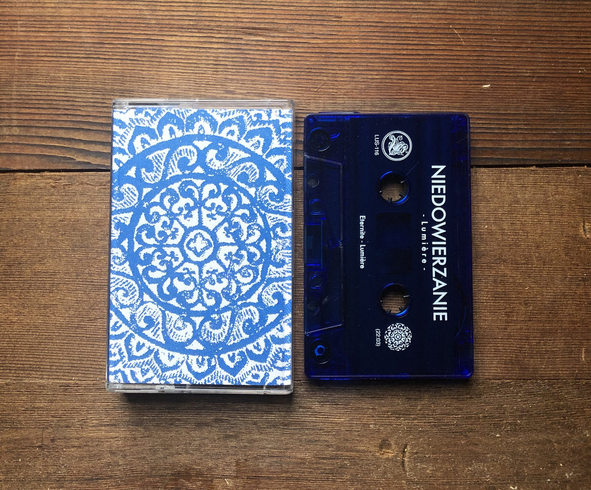 Last few copies! Professionally duplicated to Type II Chrome, translucent blue shell cassette with white imprint comes packaged with double sided blue and white “Mandala” process print J-card on 80lb gloss cardstock in clear Norelco case.